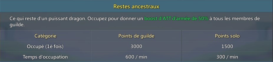- Les guildes recevrons des points de guilde pour la première occupation de chaque bastion. Les membre de la guilde qui ont envoyé des troupes au bastion recevront également des points solo.