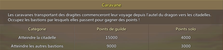 - Quand une caravane atteint un bastion, la guilde qui l'occupe gagnes des points supplémentaire. S'il y a une bataille pour un bastion, la caravane s'arrêtera jusqu'à ce qu'une équipe soit victorieuse.