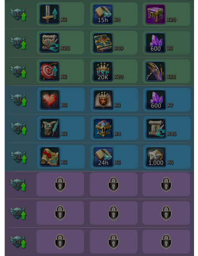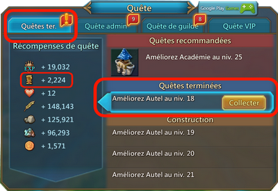 Le nombre de vos quêtes Admin, Guilde et VIP s'apprécient en fonction de votre niveau VIP. Par exemple, au niveau VIP 12, vous aurez accès à 9 quêtes Admin et 8 quêtes Guilde à chaque réinitialisation et à 5 coffres (quêtes VIP).