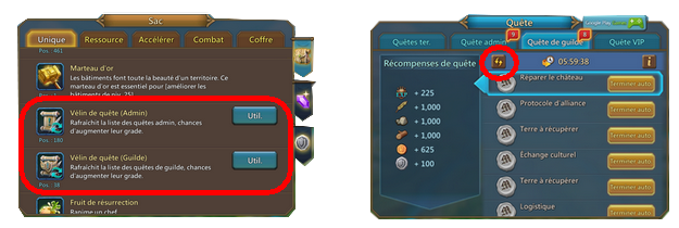 Vous pouvez réinitialiser de vous même les quêtes Admin et Guilde soit à partir de votre sac, soit à partir de l'interface de quêtes :