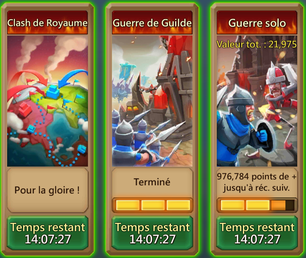- Effectuer une "Guerre de Guilde" : ici, tous les points des membres de votre guilde sont ajoutés pour former un ensemble. Là aussi, trois étapes peuvent être atteintes: 4 725 000, 12 600 000 et 31 500 000.