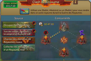 Le Kingdom vs Kingdom est un événement guerrier. Votre royaume sera placé en concurrence avec 1, 2 ou 3 autres royaumes toutes les trois semaines. Les vainqueurs pourront bénéficier de filons de gemmes du niveau 1 à 5 ; les perdants pourront bénéficier de filons de gemmes du niveau 1 à 2.